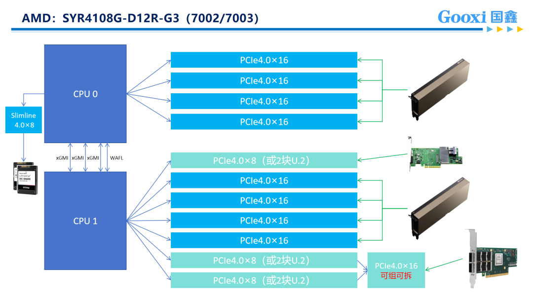 以Gooxi AMD Milan平台4U8卡AI服务器为例:它内部搭载2颗AMD第三代处理器,分为128个lan,CPU与CPU中间顺利获得三条Xgmi联通,因而整机可给予128x2-(32x3)=160条PCIE lane。8张双宽GPU占用了16x8=128条PCIE通道后,还有剩余的32条可供其他网卡、raid卡等部件使用,因而它采用直连方式。