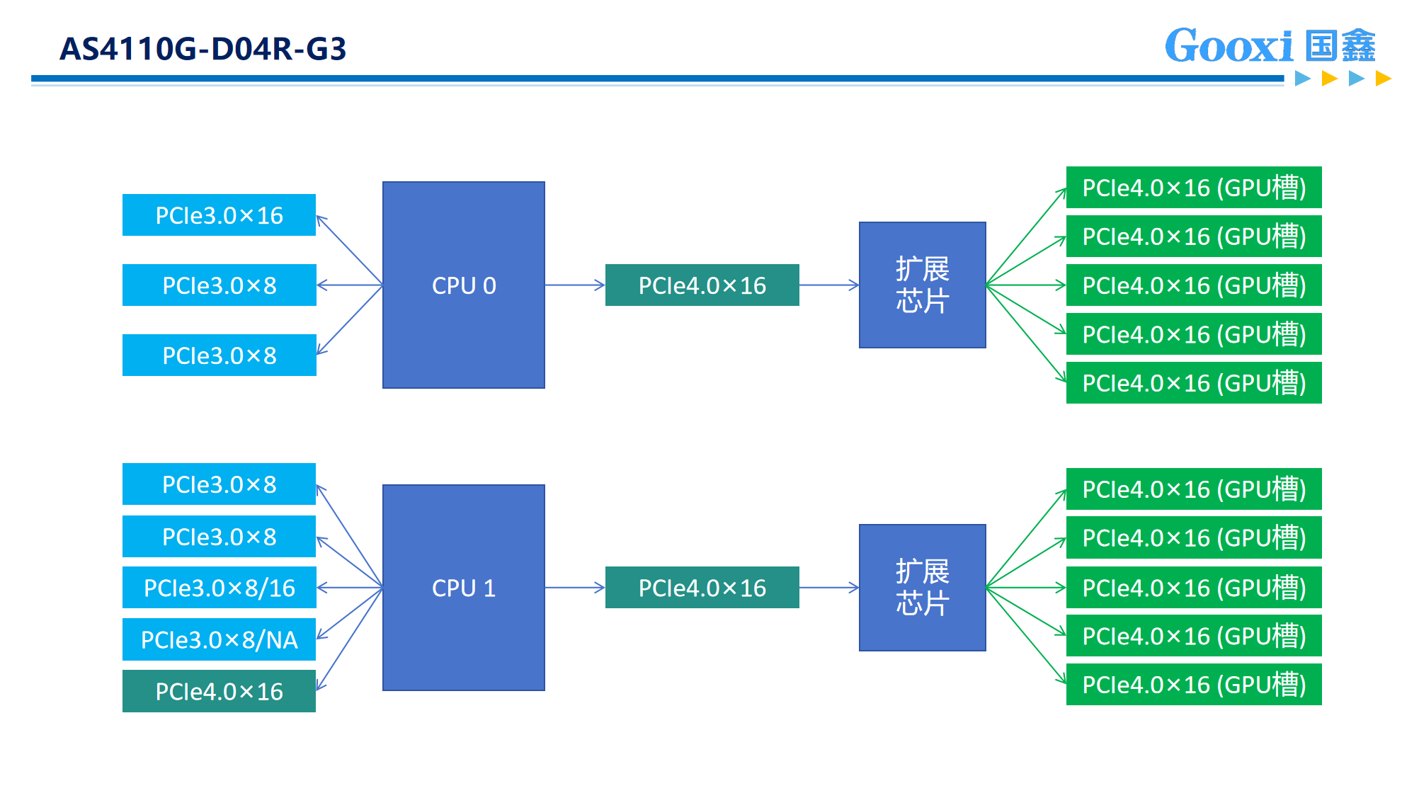 以Gooxi 的Intel Whitley平台4U10卡AI服务器为例:它内部搭载2颗第三代英特尔至强可扩展处理器,分别为64个lan,整机可给予64x2=128个PClElane,而常用的8张双宽GPU卡往往会占用掉全部的PClE lan(16×8=128),更有甚者在使用10GPU卡的情况下,PClE lan的占用更是达到了160 lan(16×10=160)。因而原本的PCIE通道不够用之后就不得不采用2个Switch芯片进行信号扩展。所以当使用扩展机型时,需要从每颗CPU各调出16个lan连接到Switch芯片,然后Switch芯片再把信号进行增强和放大处理,各扩展出5个PClE×16的槽(共10个PClE×16的槽),而CPU因为各自只调用了16个lan,所以还剩下48个lan(共96个lan)可以扩展出其他的×16或×8的PClE供网卡、RAID卡等扩展卡,或是NVMe硬盘使用。对比业内其他同平台的4U10卡服务器,Gooxi 的Intel Whitley平台,在满足10张GPU卡后,仍拥有多至8个PCIe扩展槽供网卡和RAID卡等使用,更能满足用户复杂多样的应用场景。