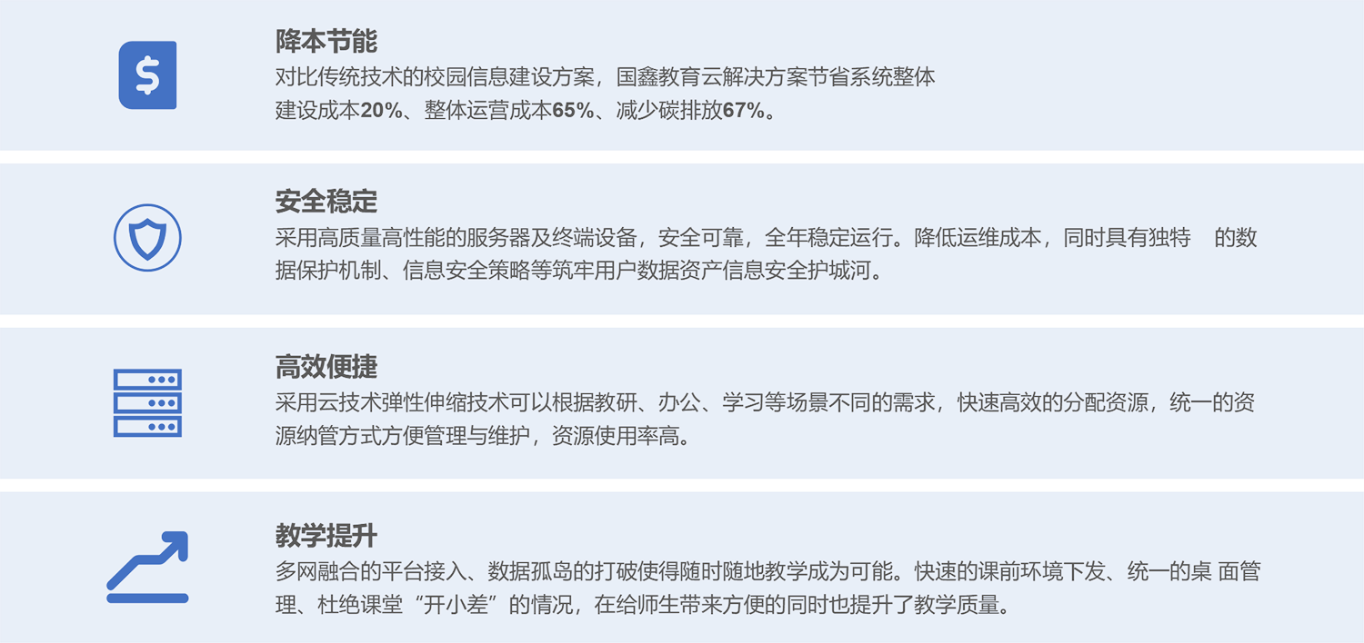 PA视讯国际教育云解决方案是针对教育业现状及遵循政策指导方向,采用自研国产硬件及自研软件平台,推出的教育行业云平台方案。方案基于云计算技术、互联网+战略格局、契合融合创新的思路,助力校园智慧建设,更好地为教育改革和开展给予信息化基础环境支撑。